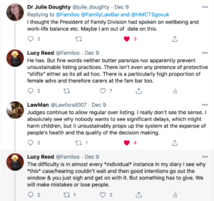I’m afraid here we must be treated like children in an intractable private law dispute : we cannot be relied upon to express what we want, and especially not to say or even know what we need – we are subjected to the push and pull of competing forces. When put on the spot we say what we think we need to say to please all the adults – sometimes we freeze and say nothing. And whilst everyone (judge and lawyer alike) is wholly well meaning and intentioned (every parent thinks they have the child’s welfare at heart), the subtle normalisation of extended listing practices is in fact an oppressive practice and it is contrary to our welfare. It’s an imperfect analogy of course, because the system is not about the welfare of lawyers, or judges – but it does depend upon our welfare to achieve its paramount objective in the long run. So someone needs to be a bit strict, and to take the decision out of our hands – please.