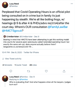 At the start of lockdown, once we’d all got over the first few weeks of panic and existential crisis and dragged ourselves out of the bed we’d lain despondently in for several weeks, there was a spirit of can-do and kindness – we were determined to look after ourselves and one another. Judges were universally insisting on a break for everyone for ten minutes every hour because remote hearings were tiring and we had to be able to concentrate, we were in it for the long haul, wellbeing and fairness mattered. Sitting days were short to normal – many judges were heard to say that 4 hours was all that was manageable in a day of remote trial work. Sitting late was frowned upon. We all had enough on our plates.